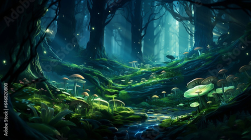 Enchanted Forest Illustration: Mystical Trees and Enigmatic Mushrooms