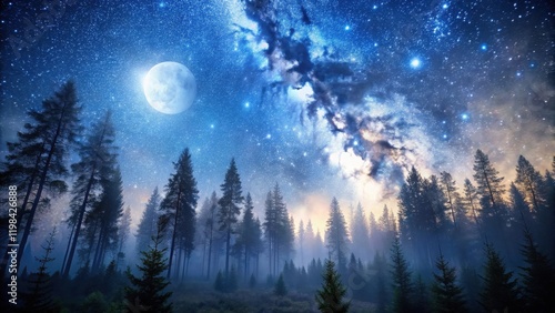 Enchanted Forest Under a Celestial Canvas of Stars and a Bright Moon