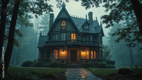 Enchanted Gothic Structure Illuminated by Warm Light in a Mystical Forest Setting