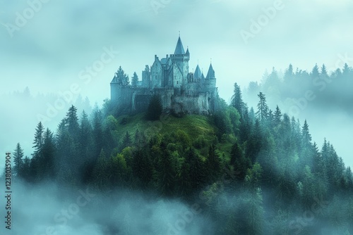 Enchanted medieval castle on misty hill surrounded by lush forest