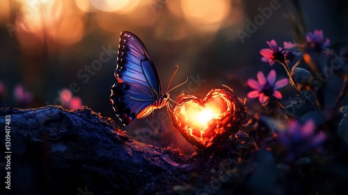 Enchanted Sunset: A Butterfly's Embrace of a Glowing Heart