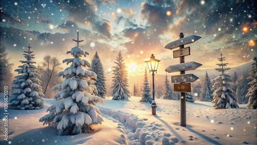 Enchanted Winter Wonderland: Surreal Snow-Covered Signs in a Dreamlike Landscape with Ethereal Lighting and Whimsical Elements for a Captivating Visual Experience