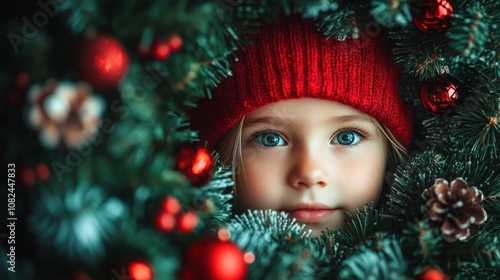 Enchanting Christmas Portrait of a Girl Framed by Festive Foliage