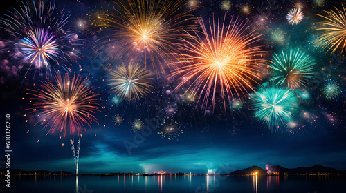 Enchanting Firework Display Lighting up the Night Sky, Enhanced with Bold and Vivid Tones to Convey a Festive and Joyous Atmosphere