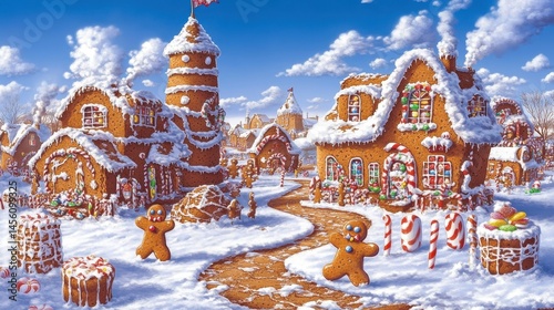 Enchanting Gingerbread Village Holiday Wonderland with Snow Covered Candy Cane Houses and Gingerbread Men Celebration Festive Atmosphere