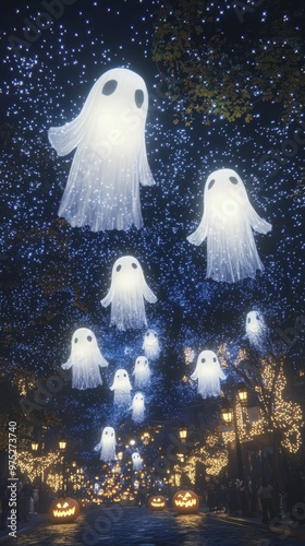 Enchanting Halloween Night with Glowing Ghosts and Jack-o'-Lanterns.