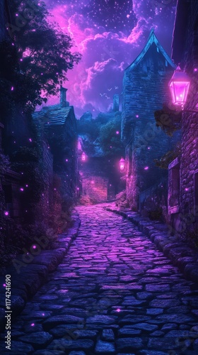 Enchanting medieval village at magical twilight with glowing lanterns sparkling lights and a mysterious atmospheric ambiance A picturesque fantastical landscape with a fairy tale