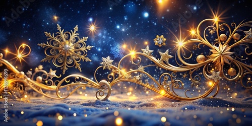 Enchanting Night Photography of Golden Swirls and Delicate Snowflakes on a Rich Blue Background Creating a Magical Winter Wonderland Atmosphere for Stock Use