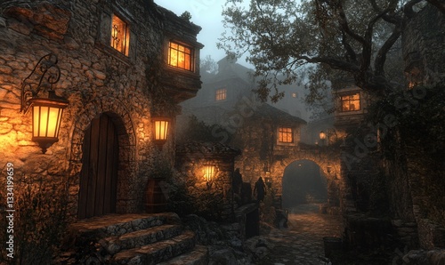 Enchanting old town street scene with glowing lanterns and stone buildings