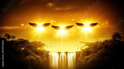 Enchanting Reflections of Waterfalls Beneath Golden Skies with Mysterious Wings and Ethereal Light