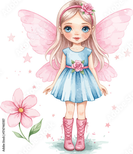 Enchanting watercolor illustration of a sweet blonde fairy girl with pink wings and blue dress