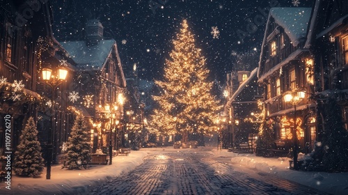 Enchanting Winter Night in Quaint Village Square with Christmas Tree and Snowflakes | Ultra-Detailed Festive Scene