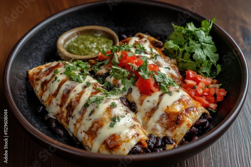 Enchiladas with black beans on dark wood Mexican cuisine flat lay