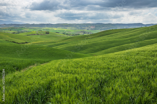 Endless green fields and meadows. Beautiful rolling green hills. Amazing Tuscany region. Italy is wonderful country, popular travel destination.