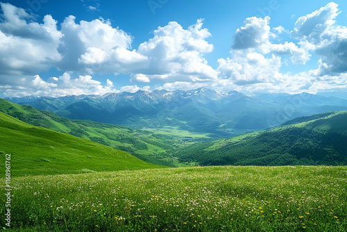 Endless green meadows overlooking vast mountain ranges under rolling clouds
