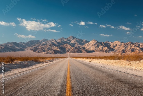 Endless open road stretches through a vast desert landscape bordered by rugged mountains under a clear blue sky