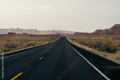 Endless Straight Road Through Desert Landscape Under Clear Blue Sky in Daylight