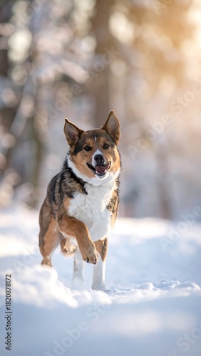 Energetic Australian Shepherd Dog Running Through Deep Winter Snow.