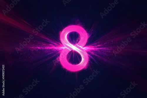 Energetic neon pink and purple rays bursting from the center "8," creating a vibrant aura on a deep black background.