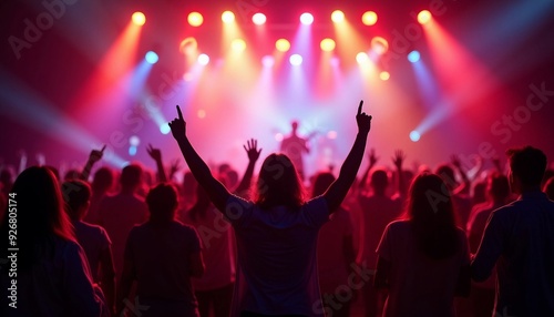 Energetic show moment with audience members as semi-silhouettes, raising their arms. Vibrant stage lights and playful shadows enhance depth of field, creating an immersive, lively atmosphere.