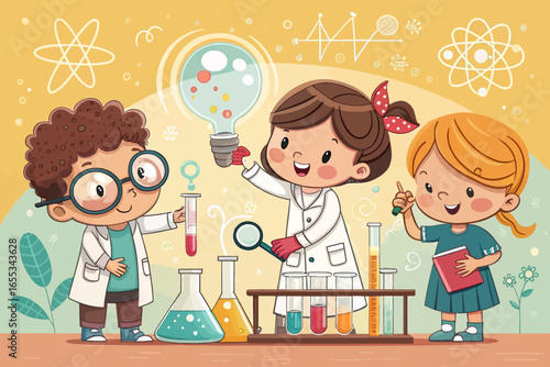 Engaging Cartoon Children Conducting Science Experiments A Vector Illustration of Young Scientists Learning Through Hands On Activities and Discovery in a Fun