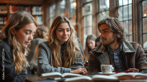 Engaging discussion among stylish students, library's archaic windows framing their future.