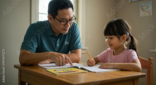 Engaging Study Session with Asian Father and Daughter at Home Table During Learning Time