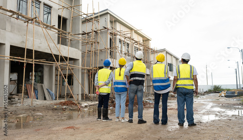 Engineer architect and foreman team celebrate residential project development success with smile at construction site. Diversity group of construction workers enjoy working and bonding with teamwork.