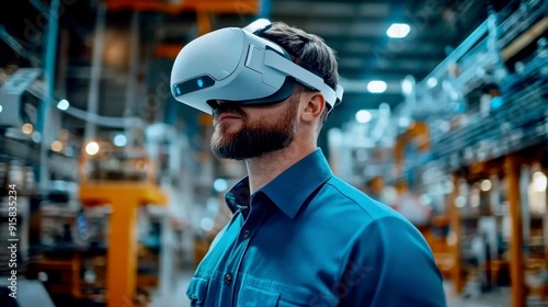 Engineer in a white VR headset at a high-tech factory. The future of manufacturing and innovation