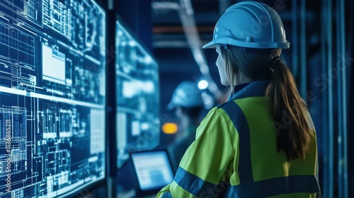 Engineer in High-Tech Control Room Overseeing Advanced Digital Operations and Systems