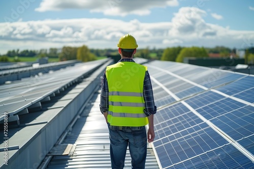 Engineer in vest checking installed solar panels on the house roof