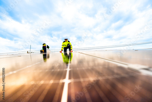 engineer man inspects construction of solar cell panel or photovoltaic cell by electronic device. Industrial Renewable energy of green power. factory worker working on tower roof.
