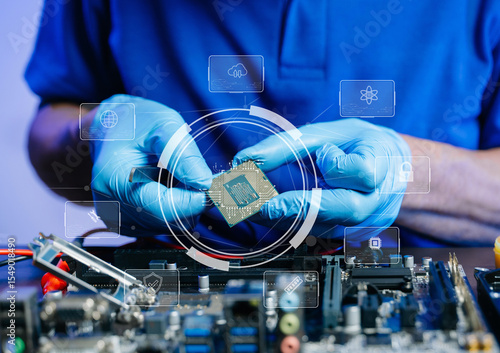 Engineer repairing motherboard with smart AI, cloud, and chip icons. Futuristic tech, hardware, and repair concept