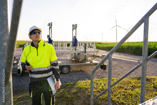 Engineer wearing hardhat examining wind turbines