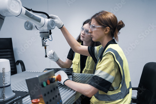 Engineer women working on AI technology in robotic electronic engineering laboratory. Smart female technician research in programming robot automation with intelligent mechanical control. Woman power.