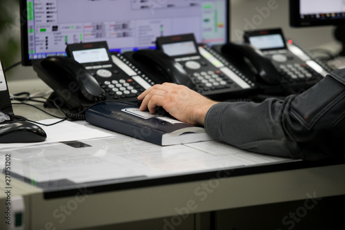 Engineering works with the tablet in the production control room.Control room of a steam Turbine,Generators of the coal-fired power plant for monitor process, business and industry concept