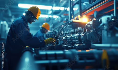 Engineers a gleaming industrial machine under cool, bright lights, highlighting precision and teamwork.