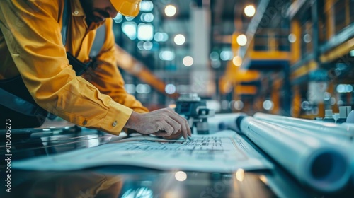 Engineers examining blueprints and discussing modifications in the factory plan.