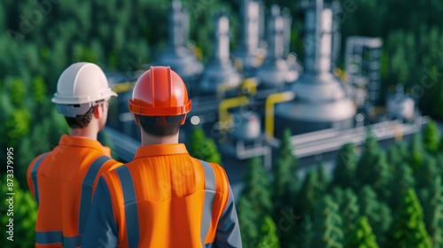 Engineers inspecting a high-tech natural gas extraction facility amidst dense forest