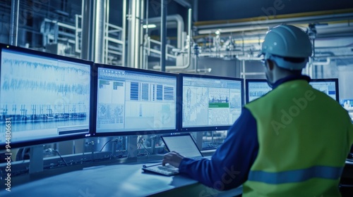 Engineers reviewing blueprints and monitoring systems in a wastewater treatment control room