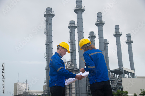 Engineers wearing safety gear, including hard hats examining survey a large blueprint tablet standing industrial facility gas or oil refinery engaged in a job requires high safety standards concept.