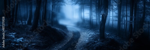 Enigmatic scene of a foggy blue forest with a winding path, exuding an air of mystery and solitude