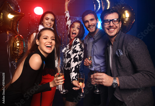 Enjoying amazing party. Group of beautiful young people dancing with champagne flutes and looking happy.