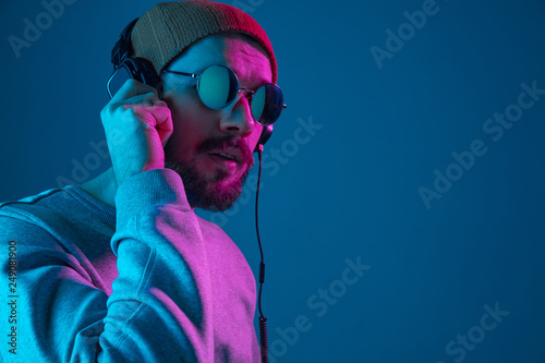 Enjoying his favorite music. Happy young stylish man in hat and sunglasses with headphones listening and smiling while standing against blue neon background