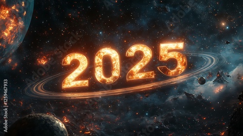 Enormous "2025" letters glowing faintly, wrapped by elegant, Saturn-like rings, surrounded by a galaxy teeming with stars, vibrant nebulae, and faint cosmic trails, photorealistic, hd quality,