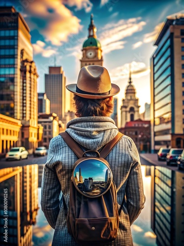 Enthusiastic traveler exploring vibrant city streets, eyes filled with wonder and curiosity, discovering new cultures and landmarks.