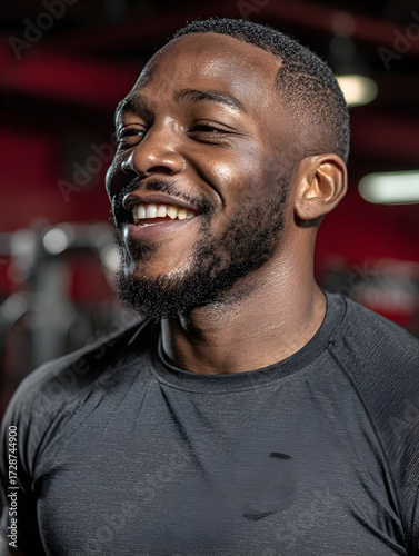 Enthusiastic young African American man smiles in a gym after an intense workout showing positivity and health.