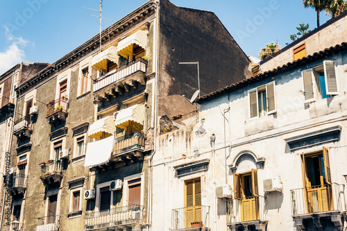 Entrance door, facade of old baroque building in Catania, traditional architecture of Sicily, Italy.