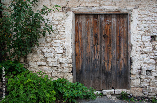 Entrance gate of an abandoned house with a closed vintage wooden door