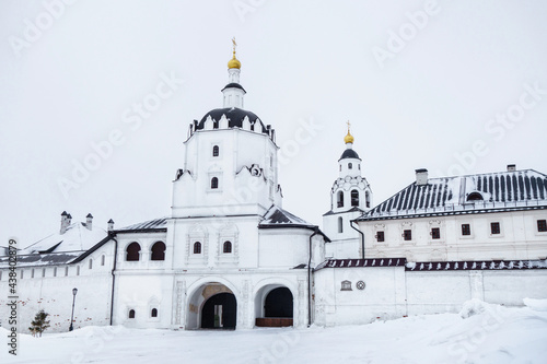 Entrance to Uspensky (Assumption) Monastery, Sviyazhsk, near Kazan, Russia. Complex was built in XVI. UNESCO heritage. Ahead: Church of Ascension of Lord, behind: bell tower of Church of Nicholas